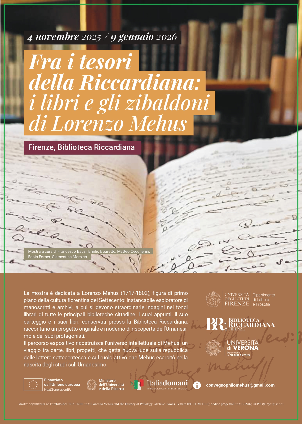 La mostra – a cura di Francesco Bausi, Emilio Boaretto, Matteo Ceccherini, Fabio Forner, Clementina Marsico – nasce dalla collaborazione della Biblioteca con l’Università di Firenze e l’Università di Verona.